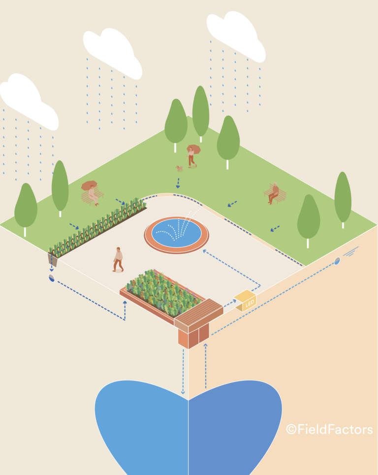 Bluebloqs is a nature-based solution that enables decentralized water management in urban zones, avoiding street flooding and ensuring fresh water availability. In fact, by collecting, treating and storing rainwater locally through an integrated circular system, Bluebloqs allows to restore the natural water cycle. The system can be applied at the building, property or neighbourhood level, adding vegetation to existing infrastructure or carrying out urban rehabilitation projects. Functional prototypes of the Bluebloqs system have been installed in several cities, including Rotterdam and The Hague (Netherlands), Aartselaar (Belgium) and Madrid (Spain). Within the project, led by Delft University of Technology, involves the Polytechnic University of Madrid, Aquafin and Field Factors. In Madrid, the functional prototype has been installed in the Caleido Tower Park, thanks to the agreement between the City Council, the project Consortium and the ownership of the “Espacio Caleido”.