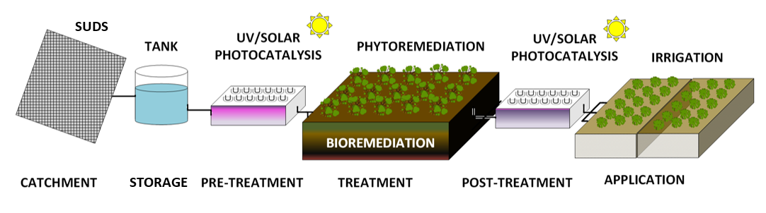 Today’s cities are far away from being resilient in water management, control of runoff and flooding events, and drought mitigation. Research about decentralised solutions for water management and treatment, including green infrastructure for rainwater harvesting and treatment, can provide an additional source of usable rainwater supply, implying important benefits such as lower heat levels in the cities, flooding reduction and growing of urban green infrastructure, including urban agriculture. The application of nature-based solutions (bio- and phytoremediation) has proven to be a possible solution for wastewater management in many situations, but it is necessary to develop more research with the objective of consolidating its implementation potential. In particular, the combination of these technologies with photocatalytic processes, can be crucial to ensure the elimination of bio-recalcitrant compounds and pathogens presence. The main hypothesis of this proposal is that urban rainwater could be collected and decontaminated efficiently trough feasible treatment strategies, combining nature-based technologies with photocatalytic treatment with the aim of meeting water quality requirements for a series of applications that replace the use of drinking water.